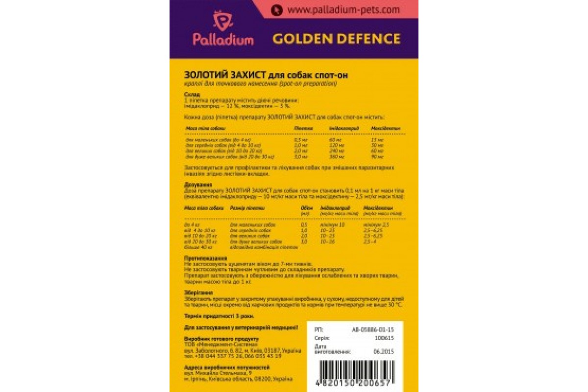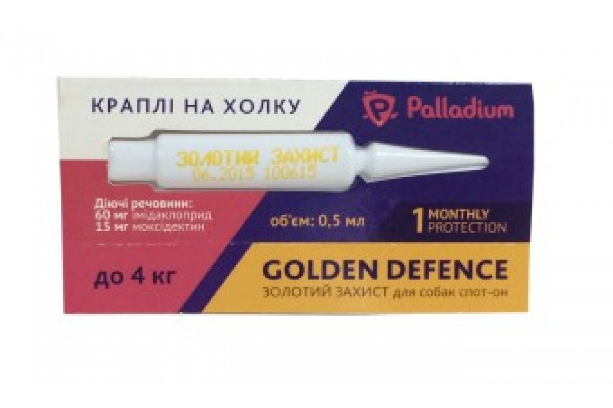 <p class="desc-heading-2" style="border: 0px; font-size: 18px; font-family: " trebuchet="" ms line-height:="" color:="" rgb padding:="" margin-bottom:=""><span style="font-family: Arial, sans-serif; font-size: 12px;">Капли на холку серии Golden Defence являются высокоэффективным профессиональным средством для борьбы с широким спектром паразитов у домашних животных - блохами и их личинками, клещами (кроме иксодового клеща), вшами, власоедами, гельминтами.</span></p> <div class="cc-hdr" style="margin: 2px 0px 8px; padding: 10px 0px 2px; font-variant-numeric: normal; font-variant-east-asian: normal; font-weight: bold; font-stretch: normal; font-size: 16px; line-height: 18px; font-family: Arial;">Описание</div> <div class="cc-info" itemprop="description" style="margin: 0px; padding: 4px 0px 6px; font-variant-numeric: normal; font-variant-east-asian: normal; font-stretch: normal; font-size: 14px; line-height: 24px; font-family: Arial;"> <div style="margin: 0px; padding: 0px; text-align: justify;">Капли на холку <strong>Golden Defence</strong> - это профессиональный ветеринарный препарат, который обеспечивает эффективное лечение и надежную защиту домашних животных от внутренних и наружных паразитов, находящихся на разных стадиях развития:</div> <ul> <li> <strong>блохи </strong>(<em>Ctenocephalides cani</em>s);</li> <li> <strong>вши </strong>(<em>Linognathus setosus</em>), <strong>власоеды </strong>(<em>Trichodectes canis</em>);</li> <li style="text-align: justify;"> <strong>клещевые заболевания</strong> - демодекоз (<em>Demodex canis</em>), отодектоз (<em>ушной клещ, Otodectes cynotis), саркоптоз (чесоточный клещ, Sarcoptes scabiei var. canis)</em>;</li> <li style="text-align: justify;"> <strong>сердечные, легочные и желудочно-кишечные гельминты </strong>(<em>Dirofilaria immitis</em> - микродирофилярии (личинки L3 и L4); <em>Angiostrongylus vasorum</em> - личинка L4, незрелые; <em>Сrenosoma vulpis</em>;<em>Toxocara canis</em> - личинки L4, незрелые и зрелые; <em>Ancylostoma caninum</em> и <em>Uncinaria stenocephala</em>; <em>Toxascaris leonine</em> - имаго; <em>Trichuris vulpis</em>).</li> </ul> <div style="margin: 0px; padding: 0px; text-align: justify;">Препарат может применяться в качестве одного из средств при лечении аллергического блошиного дерматита.<br> </div> <div style="margin: 0px; padding: 0px; text-align: justify;">Длительное действие препарата (около 30 дней) обеспечивается входящими в его состав действующими веществами.</div> <br>Основные действующие вещества препарата:<br>- имидаклоприд - 12%;<br>- моксидектин - 3%.<br><br>Вспомогательные вещества: бензиловый спирт, Н-метилпиролидон, каприловый триглицерид, ПЕГ-400.<br><br>Каждая пипетка содержит:<br><br><table class="pinf-table" style="border: 0px; margin: 0px; padding: 0px;"><tbody> <tr> <th style="padding: 12px 10px 6px; background-color: rgb(241, 243, 243); border-left: 0px; width: 274px; text-align: center;"> </th> <th style="padding: 12px 10px 6px; background-color: rgb(241, 243, 243); border-left: 1px solid rgb(255, 255, 255); width: 90px; text-align: center;">Пипетка</th> <th style="padding: 12px 10px 6px; background-color: rgb(241, 243, 243); border-left: 1px solid rgb(255, 255, 255); width: 151px; text-align: center;">Имидаклоприд</th> <th style="padding: 12px 10px 6px; background-color: rgb(241, 243, 243); border-left: 1px solid rgb(255, 255, 255); width: 123px; text-align: center;">Моксидектин</th> </tr> <tr> <td style="padding: 4px 10px; text-align: center; border-bottom: 1px solid rgb(241, 243, 243); border-left: 0px; width: 274px;">для собак с массой тела до 4 кг</td> <td style="padding: 4px 10px; text-align: center; border-bottom: 1px solid rgb(241, 243, 243); border-left: 1px solid rgb(255, 255, 255); width: 90px;">0,5 мл</td> <td style="padding: 4px 10px; text-align: center; border-bottom: 1px solid rgb(241, 243, 243); border-left: 1px solid rgb(255, 255, 255); width: 151px;">60 мг</td> <td style="padding: 4px 10px; text-align: center; border-bottom: 1px solid rgb(241, 243, 243); border-left: 1px solid rgb(255, 255, 255); width: 123px;">15 мг</td> </tr> </tbody></table> <br>Препарат представляет собой прозрачный раствор для наружного применения.</div> <div class="cc-info" itemprop="description" style="margin: 0px; padding: 4px 0px 6px; font-variant-numeric: normal; font-variant-east-asian: normal; font-stretch: normal; font-size: 14px; line-height: 24px; font-family: Arial;"> <h2 class="cc-hdr" style="margin: 2px 0px 8px; padding: 10px 0px 2px; font-variant-numeric: normal; font-variant-east-asian: normal; font-weight: bold; font-stretch: normal; font-size: 16px; line-height: 18px; font-family: Arial; color: rgb(0, 0, 0);">Дозировка и применение</h2> <div class="cc-info" itemprop="description" style="margin: 0px; padding: 4px 0px 6px; font-variant-numeric: normal; font-variant-east-asian: normal; font-stretch: normal; line-height: 24px;">Минима