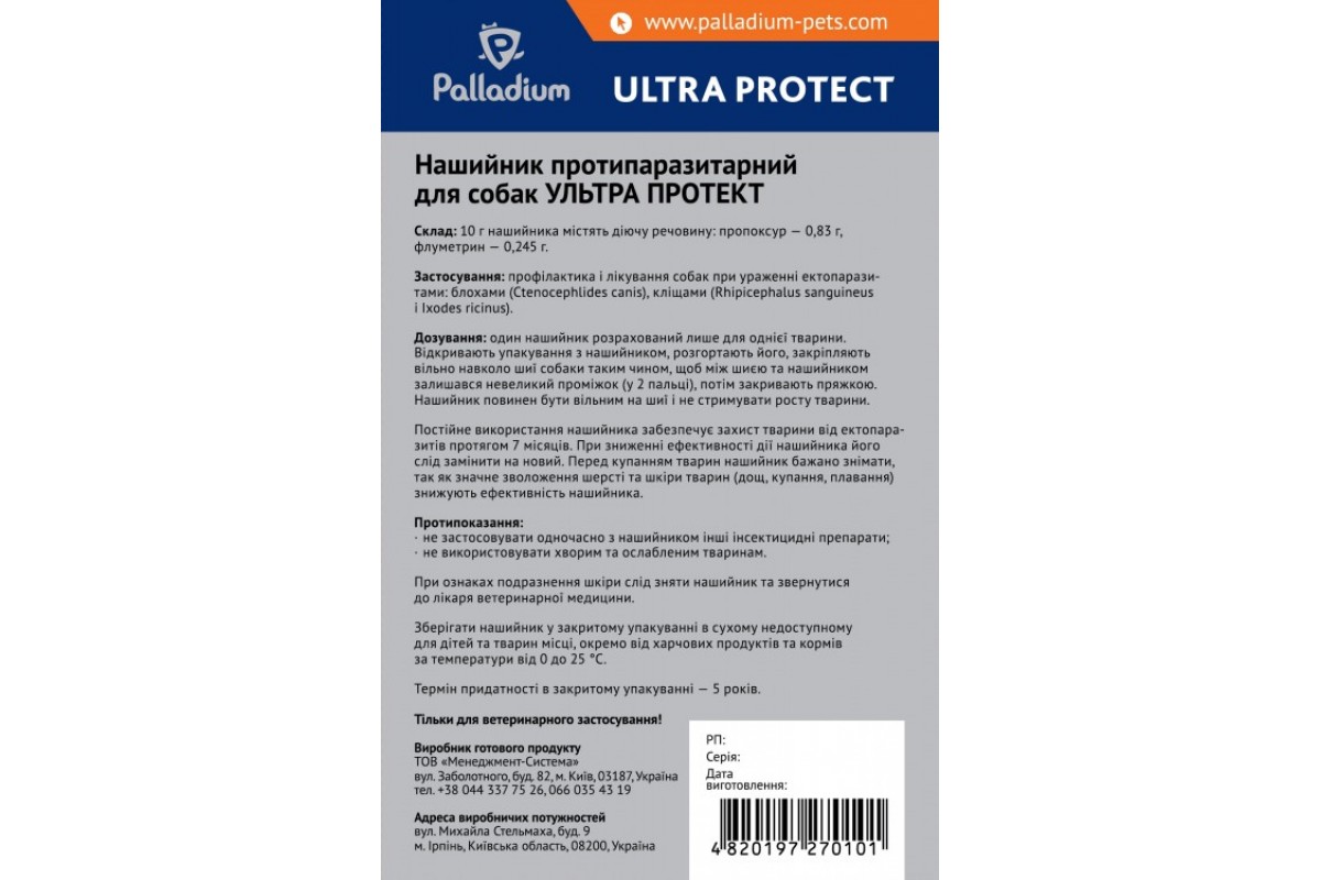 <span class="js-description-block" style="border: none; color: rgb(0, 0, 0); font-family: " open="" sans sans-serif font-size:="" font-weight:="" margin-right:="" margin-bottom:="" margin-left:="" padding:=""><div class="cc-hdr" style="margin: 2px 0px 8px; padding: 10px 0px 2px; font-variant-numeric: normal; font-variant-east-asian: normal; font-weight: bold; font-stretch: normal; font-size: 16px; line-height: 18px; font-family: Arial;">Описание</div> <div class="cc-info" itemprop="description" style="margin: 0px; padding: 4px 0px 6px; font-variant-numeric: normal; font-variant-east-asian: normal; font-stretch: normal; font-size: 14px; line-height: 24px; font-family: Arial;"><div style="margin: 0px; padding: 0px; text-align: justify;"> <p style="margin-bottom: 0.5em; padding: 0px;">Ошейник для собак <strong>Ultra Protect</strong> - инсектоакарицидный препарат, который предназначен для уничтожения блох и иксодовых клещей, паразитирующих на собаках, а также для защиты от их нападения.</p> <p style="margin-bottom: 0.5em; padding: 0px;"><strong>Действующие вещества:</strong> пропоксур, флуметрин (10,0 г ошейника содержат 0,83 г пропоксура и 0,245 г флуметрина).</p> <p style="margin-bottom: 0.5em; padding: 0px;">По внешнему виду ошейник <strong>Ultra Protect </strong>представляет собой полимерную ленту длиной 70 см с петлями для фиксации. Ошейники выпускаются белого, красного и синего цвета.</p> <p style="margin-bottom: 0.5em; padding: 0px;"><strong>Показания</strong>: Профилактика и лечение собак при поражении эктопаразитами:</p> <ul> <li>блохи (Ctenocephalides canis);</li> <li>иксодовые клещи (Rhipicephalus sanguineus, Ixodes ricinus).</li> </ul> <p style="margin-bottom: 0.5em; padding: 0px;"><strong>Применение:</strong> Один ошейник рассчитан только для одного животного. Открывают упаковку с ошейником, разворачивают его, закрепляют свободно вокруг шеи собаки таким образом, чтобы между шеей и ошейником оставался небольшой промежуток (в 2 пальца), затем закрывают пряжкой. Ошейник должен быть свободным на шее и не сдерживать рост животного.</p> <p style="margin-bottom: 0.5em; padding: 0px;">Постоянное использование ошейника обеспечивает защиту животного от эктопаразитов до 7-ми месяцев. При снижении эффективности действия ошейника его следует заменить на новый. Перед купанием животных ошейник желательно снимать, так как значительное увлажнение шерсти и кожи животных (дождь, купание, плавание) снижают эффективность ошейника.</p> <p style="margin-bottom: 0.5em; padding: 0px;"><strong>Безопасность:</strong> Препарат прошел все клинические испытания. Безопасность препарата для животных полностью подтверждена (при условии использования согласно инструкции).</p> <p style="margin-bottom: 0.5em; padding: 0px;"><strong>Противопоказания:</strong></p> <ul> <li style="text-align: justify;">не применять одновременно с ошейником другие инсектицидные препараты;</li> <li style="text-align: justify;">не использовать больным и ослабленным животным.</li> </ul> <p style="margin-bottom: 0.5em; padding: 0px;">При признаках раздражения кожи следует снять ошейник и обратиться к врачу ветеринарной медицины.</p> <p style="margin-bottom: 0.5em; padding: 0px;">Хранить ошейник в закрытой упаковке в сухом недоступном для детей и животных месте, отдельно от пищевых продуктов и кормов при температуре от 0 до 25 ° С. Срок годности в закрытой упаковке - 5 лет, после вскрытия упаковки - 6 месяцев.</p> </div></div></span><div style="margin: 0px; padding: 0px; text-align: justify;"> <p style="margin-bottom: 0.5em; padding: 0px;">Ошейник для собак <strong>Ultra Protect</strong> - инсектоакарицидный препарат, который предназначен для уничтожения блох и иксодовых клещей, паразитирующих на собаках, а также для защиты от их нападения.</p> <p style="margin-bottom: 0.5em; padding: 0px;"><strong>Действующие вещества:</strong> пропоксур, флуметрин (10,0 г ошейника содержат 0,83 г пропоксура и 0,245 г флуметрина).</p> <p style="margin-bottom: 0.5em; padding: 0px;">По внешнему виду ошейник <strong>Ultra Protect </strong>представляет собой полимерную ленту длиной 70 см с петлями для фиксации. Ошейники выпускаются 