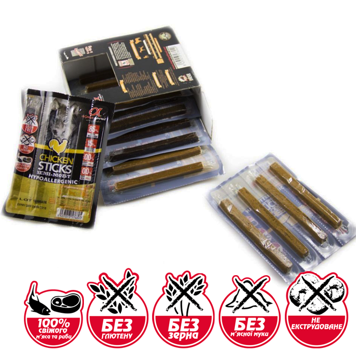<p><strong>Alpha Spirit Sticks</strong> - смачні гіпоалергенні беззернові напіввологі ласощі для собак, що містять 85% високоякісних свіжих м&#39;яса і риби. Можуть служити корисним доповненням до основного харчування Вашого вихованця. В одній упаковці міститься шість різних варіантів смаку. М&#39;ясо: яловичини, ягняти, курки, печінки, риби, а також ласощі c сиром і йогуртом.&nbsp;</p> <p>Палички Alpha Spirit Dog виготовляються тільки з 100% натуральних інгредієнтів та відрізняються відмінною смаковитістю. Нагорода, що означатиме неймовірну похвалу для вашої собаки. Зручно використовується з легкістю та чистотою.&nbsp;</p> <p>Беззернова формула ласощів особливо корисна для собак, які страждають на алергію, і добре сприймається навіть самими вибагливими і чутливими тваринами. Нова технологія виготовлення ласощів забезпечує легке перетравлювання їжі і швидке засвоєння білків і поживних речовин.&nbsp;</p> <p>Завдяки тому, що продукт поміщений в окремі упаковки, тривалий час зберігається його свіжість і корисні якості. Термін придатності продукту до відкриття упаковки становить 18 місяців і 30 днів після відкриття упаковки.</p> <p><strong>До упаковки входять&nbsp;Палички Alpha Spirit&nbsp; в 6 різних ароматах по 4 палички</strong></p> <p><strong>СКЛАД:</strong></p> <p><strong>СТІК З КУРКОЮ:&nbsp;</strong><br /> 85% свіжого м&#39;яса і свіжої риби (55% свіжої курки, 20% свіжої свинячої печінки 10% свіжої риби).&nbsp;<br /> Бобові культури: 3.76% зеленого горошку, 3.75% білого горошку, 1% чечевиці.<br /> Функціональні інгредієнти: 3% гліцерину, 2.09% сухих водоростей, 0.70% пивних дріжжів, 0.15% глюкозаміну,<br /> 0.1% хондроїтинсульфату.<br /> Харчові добавки:0.45% гідрат хелатних амінокислот цинку (675 мг/кг елемента). .</p> <p>Протеїн 32%, жир 8%, зола 9,5%, Клітковина 1%, Вологість 20%.</p> <p><strong>СТІК З СИРОМ та ЙОГУРТОМ:&nbsp;</strong><br /> 75% свіжого м&#39;яса і свіжої риби (55% свіжої курки, 20% свіжої свинячої печінки, 5% сира, 5% йогурту).<br /> Бобові культури: 3.76% зеленого горошку, 3.75% білого горошку, 1% чечевиці.<br /> Функціональні інгредієнти: 3% гліцерину, 2.09% сухих водоростей, 0.70% пивних дріжжів, 0.15% глюкозаміну,<br /> 0.1% хондроїтинсульфату.<br /> Харчові добавки:0.45% гідрат хелатних амінокислот цинку (675 мг/кг елемента) .</p> <p>Протеїн 32%, жир 8%, зола 9,5%, Клітковина 1%, Вологість 20%.</p> <p><strong>СТІК З ЯЛОВИЧИНОЮ:</strong><br /> 85% свіжого м&#39;яса і свіжої риби (35% свіжої яловичини, 20% свіжої курки, 20% свіжої свинячої печінки, 10% свіжої риби).<br /> Бобові культури: 3.76% зеленого горошку, 3.75% білого горошку, 1% чечевиці.<br /> Функціональні інгредієнти: 3% гліцерину, 2.09% сухих водоростей, 0.70% пивних дріжжів, 0.15% глюкозаміну,<br /> 0.1% хондроїтинсульфату.<br /> Харчові добавки:0.45% гідрат хелатних амінокислот цинку (675 мг/кг елемента).<br /> Протеїн 32%, жир 8%, зола 9,5%, Клітковина 1%, Вологість 20%.</p> <p><strong>СТІК З ЯГНЯТИНОЮ:&nbsp;</strong><br /> 85% свіжого м&#39;яса і свіжої риби (35% свіжого м&#39;яса ягняти, 20% свіжої курки, 20% свіжої свинячої печінки, 10% свіжої риби).<br /> Бобові культури: 3.76% зеленого горошку, 3.75% білого горошку, 1% чечевиці.<br /> Функціональні інгредієнти: 3% гліцерину, 2.09% сухих водоростей, 0.70% пивних дріжжів, 0.15% глюкозаміну,<br /> 0.1% хондроїтинсульфату.<br /> Харчові добавки:0.45% гідрат хелатних амінокислот цинку (675 мг/кг елемента).</p> <p>Протеїн 32%, жир 8%, зола 9,5%, Клітковина 1%, Вологість 20%.</p> <p><strong>СТІК З &nbsp;ПЕЧІНКОЮ:&nbsp;</strong><br /> 85% свіжого м&#39;яса і свіжої риби (55% свіжої свинячої печінки, 20% свіжої курки, 10% свіжої риби)<br /> Бобові культури: 3.76% зеленого горошку, 3.75% білого горошк